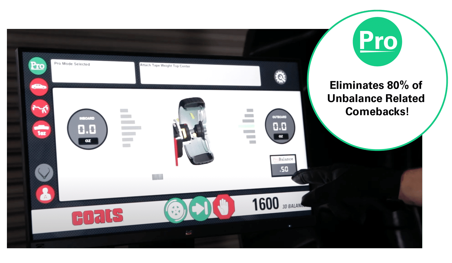 The Coats® 1600 Wheel Balancer incorporates an intuitive touchscreen to allow any technician to quickly become a seasoned professional. The easy to use, US made interface is made for US technicians.